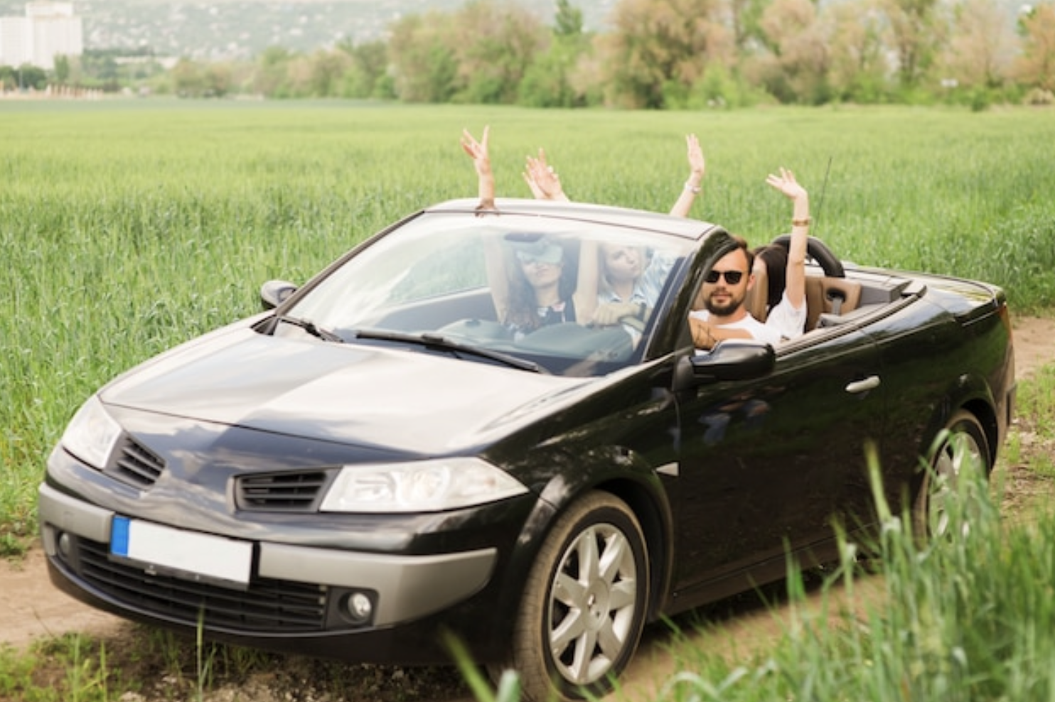 우리 모두 간신히 그의 차에 탔어요.