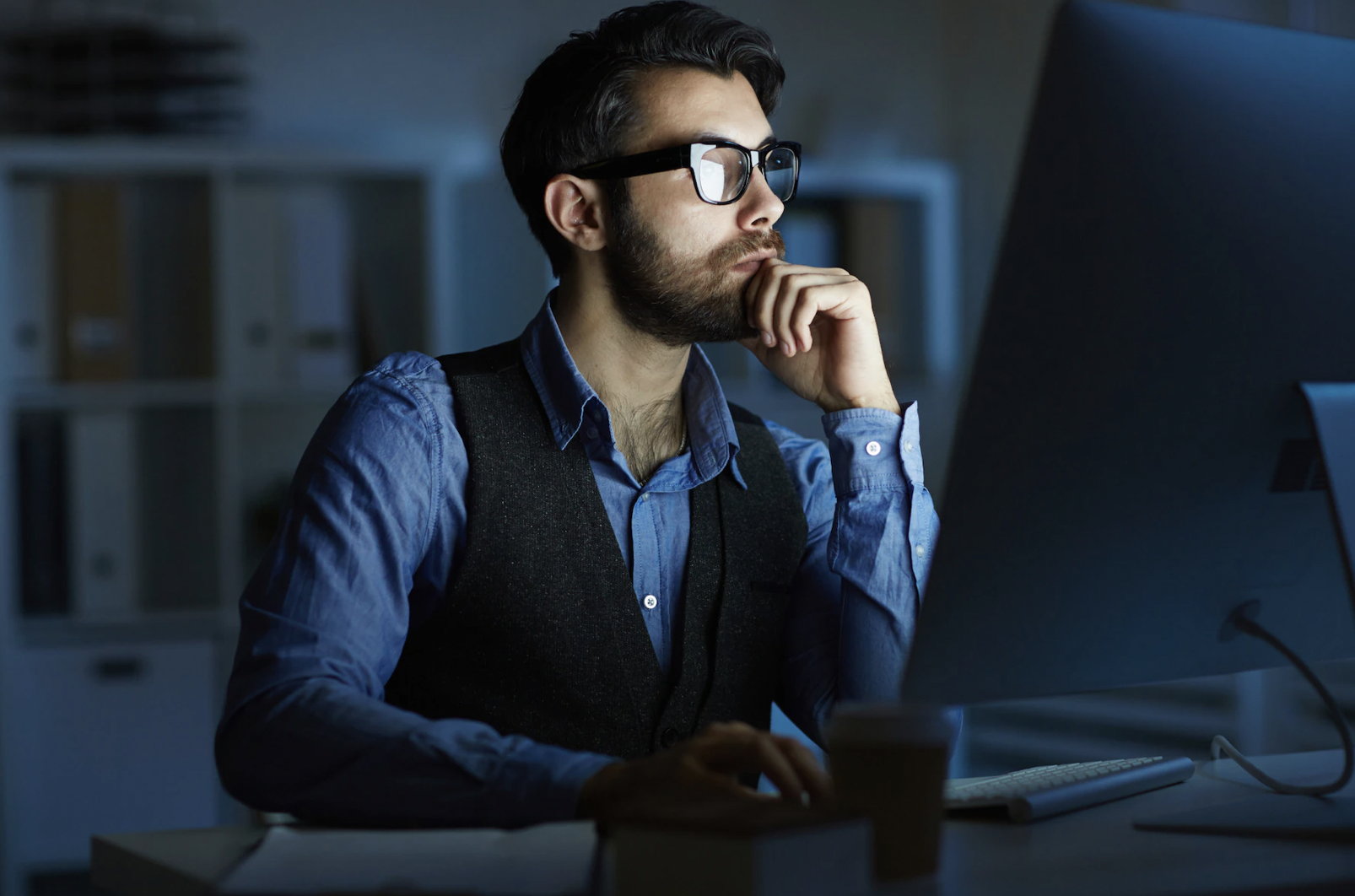 He is glued to the computer all day.