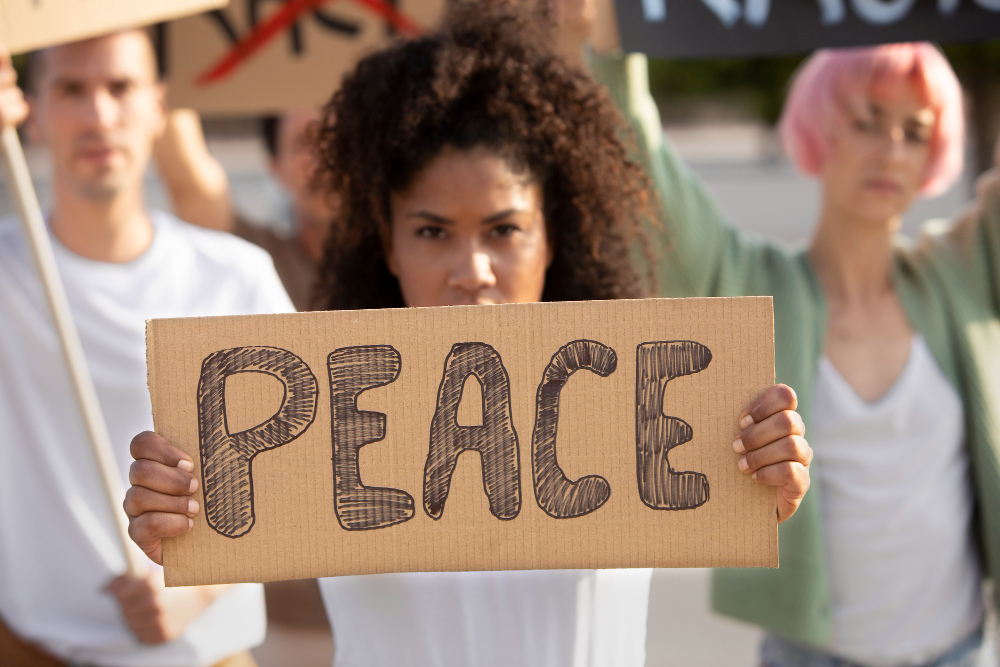 경찰이 지켜보는 가운데 그 집단은 "평화"를 요구하는 플래카드를 펼쳤습니다.
